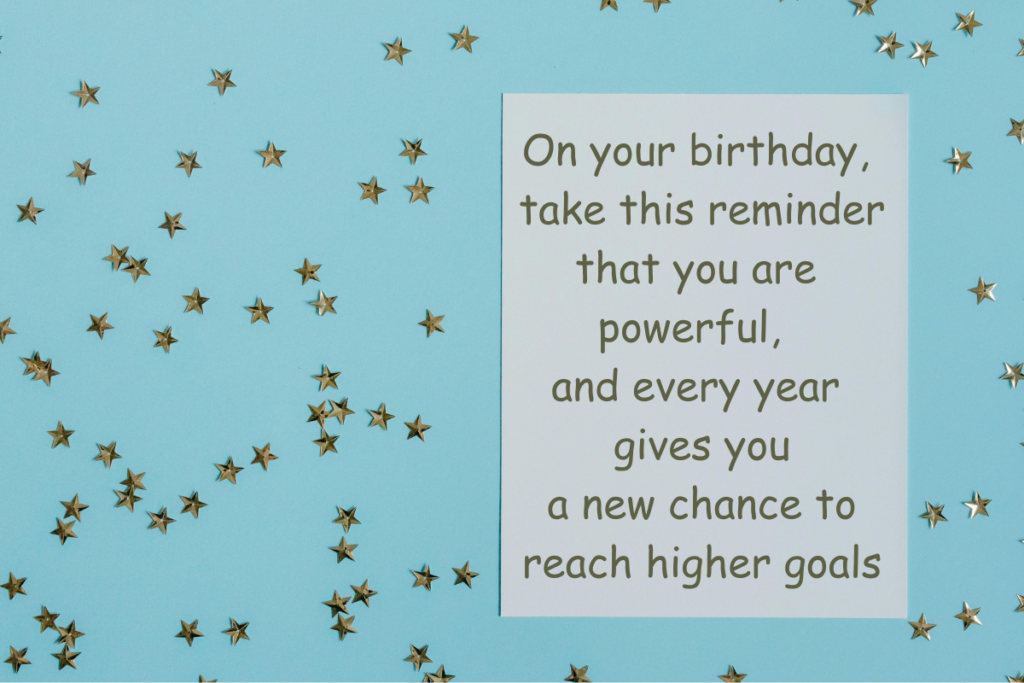 - On your birthday, take this reminder that you are powerful, and every year gives you a new chance to reach higher goals and build your greatest success story.