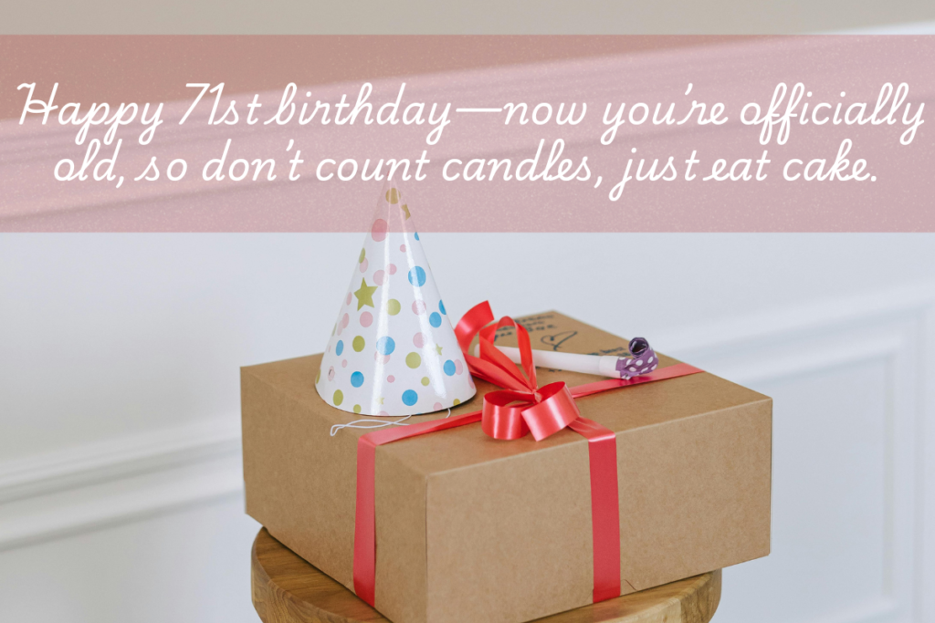 - Happy 71st birthday—now you’re officially old, so don’t count candles, just eat cake.