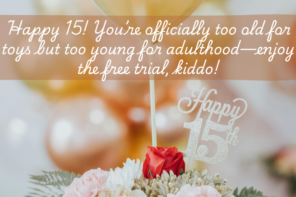 - Happy 15! You’re officially too old for toys but too young for adulthood—enjoy the free trial, kiddo!