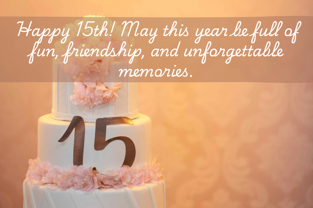 - Happy 15th! May your day be filled with cake, laughter, and all your favorite things.