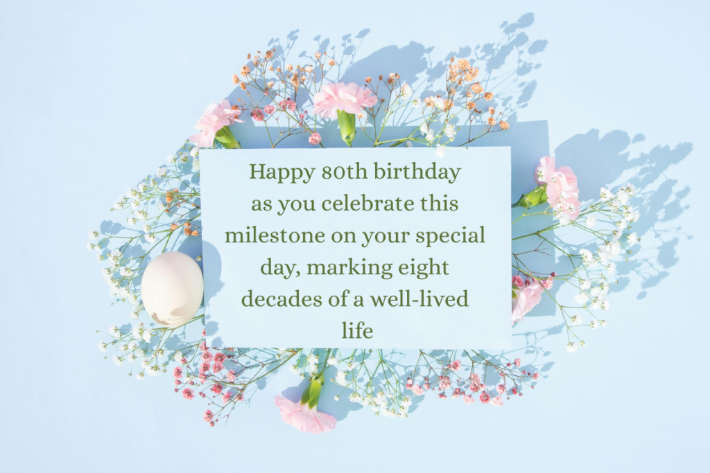 80th birthday sayings should feel special and commemorate a person’s life. They can be funny and inspiring. Because at the end of the day, the messages or greetings you send should put a smile on your loved one’s face. The best quotes for turning 80 are a mix of serious, celebratory, and humorous, making them perfect for a momentous event. Whether written in a card or shared face-to-face, you can make the day unforgettable with a catchy phrase or meaningful wishes that mark the big 8-0 with joy.